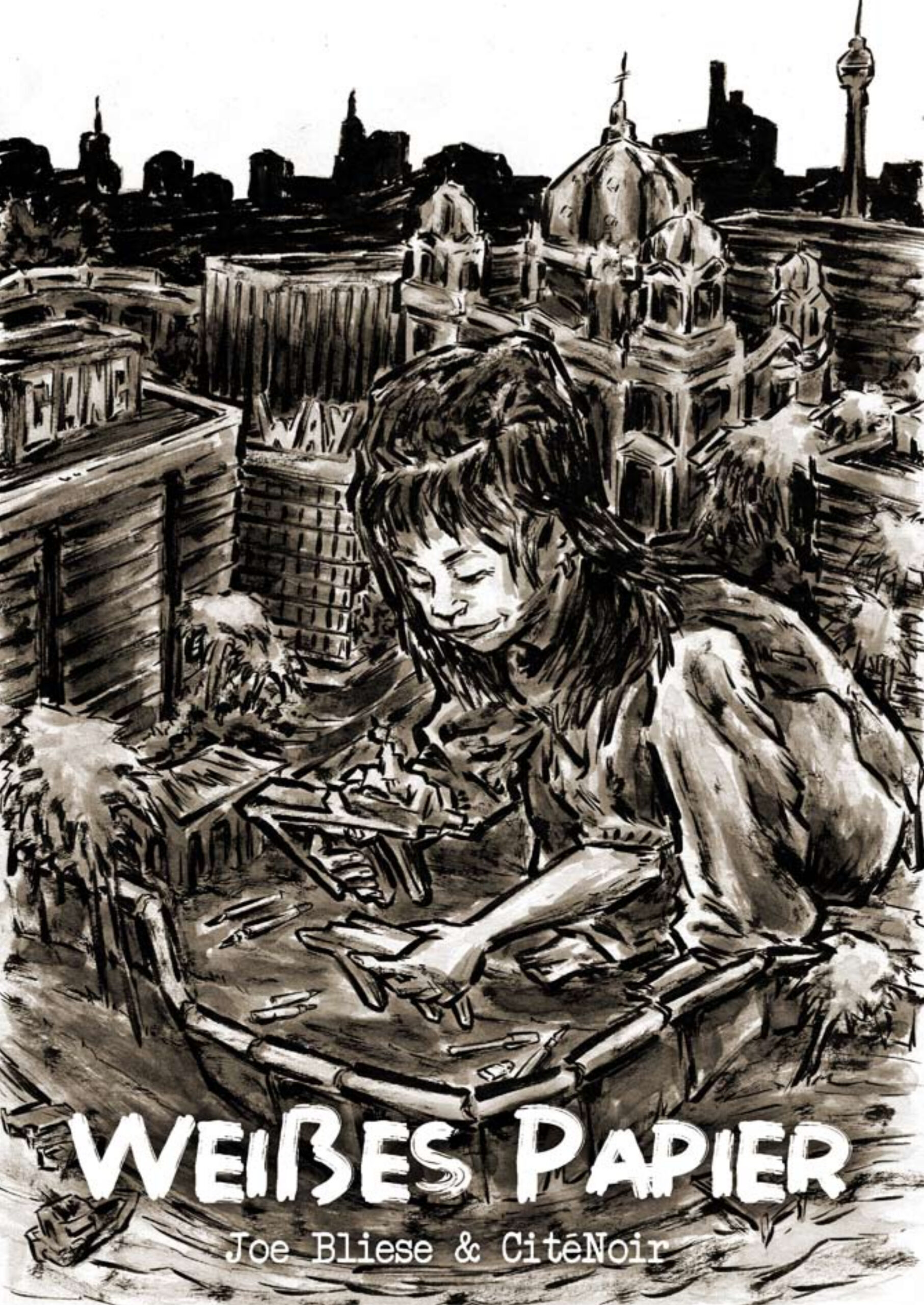 Die Graphic Novel „Weißes Papier“ basiert auf einem Gedicht von Joe Bliese, in dem er seine persönliche Wahrnehmung und kollektive Erfahrung zu einem poetischen Panorama der Stadt seit dem Mauerfall verdichtet – ein Werk zwischen Rhythmus, Reim und Zeitgeschichte. Die detaillierten und eindrücklichen Illustrationen mit Cité Noirs unverkennbarem Pinselstrich lassen uns in das Berlin des namenlosen Protagonisten eintauchen.